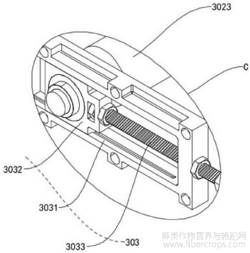 需要说明的是,使用时,通过转动锁紧螺杆3033的手轮,可驱动滑块一3032沿固定架3031的滑槽轴向移动,进而调节分料辊二3022和相应分料辊一3021的间距,针对粗茎秆加工时,调大间距,避免麻骨碎片堆积,针对细茎秆加工时,调小间距,提升初步分料效果,分料辊一3021与分料辊二3022配合,实现双重分离,提高韧皮纤维的纯度,进一步提高分料效率;