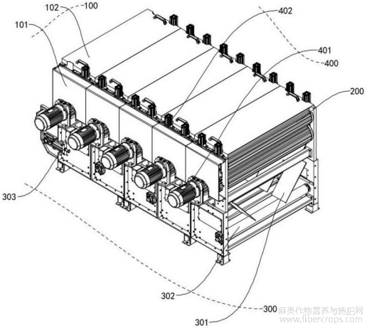 300,设置于壳体101上的导料板301、设置于导料板301下方的分料机构302,以及设置于壳体101上用于对分料机构302进行位置调整的固定机构303,驱动单元400,设置于壳体101上用于带动导料机构一201、导料机构二202、碎茎机构一203、碎茎机构二204以及导料机构三205旋转的驱动机构一401,以及设置于壳体101上用于调整导料机构一201、导料机构二202、碎茎机构一203、碎茎机构二204以及导料机构三205自身间距的驱动机构二402;壳体101内部预留安装腔室,用于固定碎茎单元200和排料单元300,壳体101顶部通过合页铰接盖板102,便于快速开启进行设备检修与维护,碎茎单元200沿亚麻杆茎输送方向依次装配于壳体101内部,导料机构一201、导料机构二202、碎茎机构一203、碎茎机构二204、导料机构三205呈直线排布,确保物料连续顺畅输送,排料单元300装配于壳体101下方,导料板301采用梯形钢板结构,用于承接碎茎后的物料并定向导流;