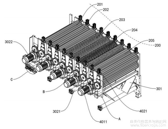 导料板301采用梯形结构,通过倾斜角度引导物料定向滑落至下方的分料机构302,分料机构302中,多组分料辊一3021沿导料板301下方均匀排布并被动旋转,利用韧皮纤维与麻骨碎片的比重、形态差异,重量较大的麻骨碎片从分料辊一3021之间的间隙下落,经专门通道排出,韧性强、重量较轻的韧皮纤维则附着在分料辊一3021表面,随辊体旋转向设备出料端输送,最终完成纤维与麻骨的精准分离,得到高质量的亚麻韧皮纤维。
