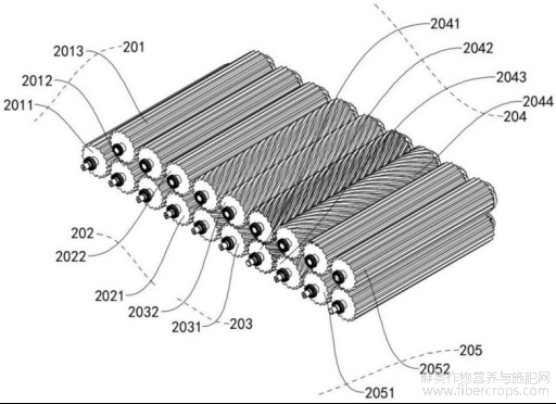 200、碎茎单元;201、导料机构一;2011、直线主动辊一;2012、直线主动辊二;2013、直线从动辊一;202、导料机构二;2021、直线主动辊三;2022、直线从动辊二;203、碎茎机构一;2031、螺旋主动辊一;2032、螺旋从动辊一;204、碎茎机构二;2041、螺旋主动辊二;2042、螺旋从动辊二;2043、螺旋主动辊三;2044、螺旋从动辊三;205、导料机构三;2051、直线主动辊四;2052、直线从动辊三;